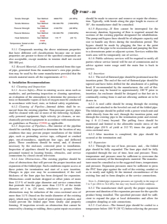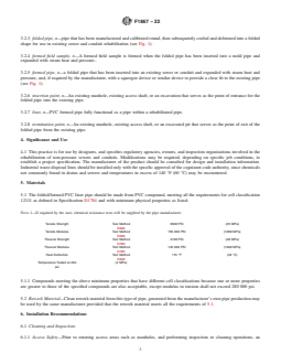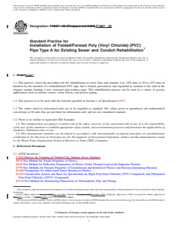 SIGNIFICANCE AND USE 4.1 This practice is for use by designers, and specifies regulatory agencies, owners, and inspection organizations involved in the rehabilitation of non-pressure sewers and conduits. Modifications may be required, depending on specific job conditions, to establish a project specification. The manufacturer of the product should be consulted for design and installation information. Industrial waste disposal lines should be installed only with the specific approval of the cognizant code authority, since chemicals not commonly found in drains and sewers and temperatures in excess of 140 °F (60 °C) may be encountered. SCOPE 1.1 This practice covers the procedures for the rehabilitation of sewer lines and conduits 4 in. (102 mm) to 18 in. (457 mm) in diameter by the insertion of a folded/formed PVC pipe that is heated, pressurized, and expanded to conform to the wall of the original conduit forming a new structural pipe-within-a-pipe. This rehabilitation process can be used in a variety of gravity applications such as sanitary sewers, storm sewers, and process piping. 1.2 This practice is to be used with the material specified in Section 6 of Specification F1871. 1.3 The values stated in inch-pound units are to be regarded as standard. The values given in parentheses are mathematical conversions to SI units that are provided for information only and are not considered standard. 1.4 There is no similar or equivalent ISO Standard. 1.5 This standard does not purport to address all of the safety concerns, if any, associated with its use. It is the responsibility of the user of this standard to establish appropriate safety, health, and environmental practices and determine the applicability of regulatory limitations prior to use. 1.6 This international standard was developed in accordance with internationally recognized principles on standardization established in the Decision on Principles for the Development of International Standards, Guides and Recommendations issued by the World Trade Organization Technical Barriers to Trade (TBT) Committee.