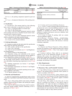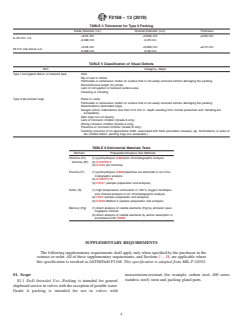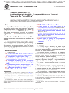 ASTM F2168-13(2019) is a technical specification published by ASTM International. Its full title is "Standard Specification for Packing Material, Graphitic, Corrugated Ribbon or Textured Tape, and Die-Formed Ring". This standard covers: ABSTRACT This specification covers various types, classes, and grades of flexible graphite material in which valve media temperatures are limited to a maximum temperature. The material shall be classified into two types, classes, and grades. Type I is a corrugated ribbon or textured tape, Type II is die-formed ring. Class 1 is for use where detrimental material content of the packing need not be controlled beyond normal manufacturing limit and Class 2 is for use where detrimental material content must be controlled to the limits specified herein. Grade A is treated with corrosion inhibitor and Grade B not treated with corrosion inhibitor. Different tests and measurements shall be conducted in order to determine the following properties: size, bulk density, ash content, and graphite purity. SCOPE 1.1 Scope—This specification covers various types, classes, and grades of flexible graphite material in which valve media temperatures are limited to a maximum of 966°C. Where this specification is invoked as ASTM F2168, Sections 1 – 18 apply. Where this specification is invoked as ASTM/DoD F2168, Sections 1 – 18 and the Supplementary Requirements apply. 1.2 The values stated in SI units are to be regarded as standard. No other units of measurement are included in this standard. 1.3 This international standard was developed in accordance with internationally recognized principles on standardization established in the Decision on Principles for the Development of International Standards, Guides and Recommendations issued by the World Trade Organization Technical Barriers to Trade (TBT) Committee.