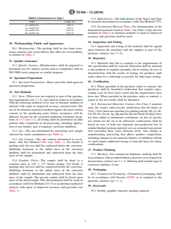 ABSTRACT This specification covers various types, classes, and grades of flexible graphite material in which valve media temperatures are limited to a maximum temperature. The material shall be classified into two types, classes, and grades. Type I is a corrugated ribbon or textured tape, Type II is die-formed ring. Class 1 is for use where detrimental material content of the packing need not be controlled beyond normal manufacturing limit and Class 2 is for use where detrimental material content must be controlled to the limits specified herein. Grade A is treated with corrosion inhibitor and Grade B not treated with corrosion inhibitor. Different tests and measurements shall be conducted in order to determine the following properties: size, bulk density, ash content, and graphite purity. SCOPE 1.1 Scope—This specification covers various types, classes, and grades of flexible graphite material in which valve media temperatures are limited to a maximum of 966°C. Where this specification is invoked as ASTM F2168, Sections 1 – 18 apply. Where this specification is invoked as ASTM/DoD F2168, Sections 1 – 18 and the Supplementary Requirements apply. 1.2 The values stated in SI units are to be regarded as standard. No other units of measurement are included in this standard. 1.3 This international standard was developed in accordance with internationally recognized principles on standardization established in the Decision on Principles for the Development of International Standards, Guides and Recommendations issued by the World Trade Organization Technical Barriers to Trade (TBT) Committee.
