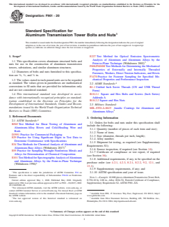 ASTM F901-20 is a technical specification published by ASTM International. Its full title is "Standard Specification for Aluminum Transmission Tower Bolts and Nuts". This standard covers: ABSTRACT This specification covers aluminum transmission tower bolts and nuts. Bolts shall be manufactured from alloy 2024 and nuts from alloy 6061 or 6262, and shall be cold formed, hot formed, or machined formed. Alloy materials for bolts and nuts shall conform to the chemical requirements of this specification. Bolts and nuts shall conform to the required tensile strength, dimensions, workmanship, finish, appearance, marking, packaging, and shipping. Test methods shall include chemical analysis, wedge tension test, shear test, and proof-stress test. SCOPE 1.1 This specification covers aluminum structural bolts and nuts for use in the construction of aluminum transmission towers, substations, and similar aluminum structures. 1.2 Diameters of bolts and nuts furnished to this specification are 5/8 , 3/4 , and 7/8 in. 1.3 The values stated in inch-pound units are to be regarded as standard. The values given in parentheses are mathematical conversions to SI units that are provided for information only and are not considered standard. 1.4 This international standard was developed in accordance with internationally recognized principles on standardization established in the Decision on Principles for the Development of International Standards, Guides and Recommendations issued by the World Trade Organization Technical Barriers to Trade (TBT) Committee.
