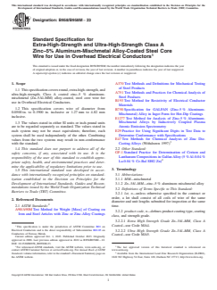 ASTM B958/B958M-23 is a technical specification published by ASTM International. Its full title is "Standard Specification for Extra-High-Strength and Ultra-High-Strength Class A Zinc–5% Aluminum-Mischmetal Alloy-Coated Steel Core Wire for Use in Overhead Electrical Conductors". This standard covers: SCOPE 1.1 This specification covers round, extra-high-strength, and ultra-high-strength, Class A coated zinc–5 % aluminum-mischmetal (Zn–5Al–MM) alloy-coated, steel core wire for use in Overhead Electrical Conductors. 1.2 This specification covers wire of diameter from 0.0500 in. to 0.1900 in. inclusive or 1.27 mm to 4.82 mm inclusive. 1.3 The values stated in either SI units or inch-pound units are to be regarded separately as standard. The values stated in each system may not be exact equivalents; therefore, each system shall be used independently of the other. Combining values from the two systems may result in non-conformance with the standard. 1.4 This standard does not purport to address all of the safety concerns, if any, associated with its use. It is the responsibility of the user of this standard to establish appropriate safety, health, and environmental practices and determine the applicability of regulatory limitations prior to use. 1.5 This international standard was developed in accordance with internationally recognized principles on standardization established in the Decision on Principles for the Development of International Standards, Guides and Recommendations issued by the World Trade Organization Technical Barriers to Trade (TBT) Committee.