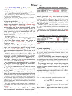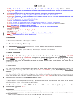 ABSTRACT This specification covers bridge bearings that consist of a spherical rotational element, where a stainless steel convex surface slides against a concave carbon steel plate covered with woven or sheet polytetrafluoroethylene (PTFE). The function of the bearing is to transfer loads and to accommodate any relative movement, including rotation between a bridge superstructure and its supporting structure, or both. The requirements of spherical bearings with a standard horizontal load (a maximum of 10 % of vertical) are discussed. The bearings are furnished in three types: fixed spherical bearing which is for rotation only, unidirectional sliding spherical bearing which is for rotation plus movement in one direction, and multi-directional sliding spherical bearing which is for rotation plus movement in all directions. The materials to be used in producing the bearings include: steel, stainless steel (flat sliding surface and convex surface), woven fabric polytetrafluoroethylene, and sheet polytetrafluoroethylene. The following different test methods shall be performed: proof load and rotation tests for fixed and expansion bearings, coefficient of friction test for expansion bearings only, PTFE (woven or sheet) bond test for expansion bearings only, and physical property test of both PTFEs for fixed and expansion bearings. SCOPE 1.1 This specification covers bridge bearings that consist of a spherical rotational element, where a stainless steel convex surface slides against a concave carbon steel plate covered with woven or sheet polytetrafluoroethylene (PTFE). The function of the bearing is to transfer loads and to accommodate any relative movement, including rotation between a bridge superstructure and its supporting structure, or both. 1.2 This specification covers the requirements of spherical bearings with a standard horizontal load (a maximum of 10 % of vertical). 1.3 The requirements stated in this specification are the minima necessary for the manufacture of quality bearing devices. It may be necessary to increase these minimum values due to other design conditions. 1.4 Units—The values stated in inch-pound units are to be regarded as standard. The values given in parentheses are mathematical conversions to SI units that are provided for information only and are not considered standard. 1.5 The text of this standard references notes and footnotes which provide explanatory material. These notes and footnotes (excluding those in tables and figures) shall not be considered as requirements of the standard. 1.6 The following safety hazards caveat pertains only to the test method portion, Section 7, of this specification: This standard does not purport to address all of the safety concerns, if any, associated with its use. It is the responsibility of the user of this standard to establish appropriate safety, health, and environmental practices and determine the applicability of regulatory limitations prior to use. 1.7 This international standard was developed in accordance with internationally recognized principles on standardization established in the Decision on Principles for the Development of International Standards, Guides and Recommendations issued by the World Trade Organization Technical Barriers to Trade (TBT) Committee.