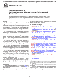 ASTM D5977-23 is a technical specification published by ASTM International. Its full title is "Standard Specification for High Load Rotational Spherical Bearings for Bridges and Structures". This standard covers: ABSTRACT This specification covers bridge bearings that consist of a spherical rotational element, where a stainless steel convex surface slides against a concave carbon steel plate covered with woven or sheet polytetrafluoroethylene (PTFE). The function of the bearing is to transfer loads and to accommodate any relative movement, including rotation between a bridge superstructure and its supporting structure, or both. The requirements of spherical bearings with a standard horizontal load (a maximum of 10 % of vertical) are discussed. The bearings are furnished in three types: fixed spherical bearing which is for rotation only, unidirectional sliding spherical bearing which is for rotation plus movement in one direction, and multi-directional sliding spherical bearing which is for rotation plus movement in all directions. The materials to be used in producing the bearings include: steel, stainless steel (flat sliding surface and convex surface), woven fabric polytetrafluoroethylene, and sheet polytetrafluoroethylene. The following different test methods shall be performed: proof load and rotation tests for fixed and expansion bearings, coefficient of friction test for expansion bearings only, PTFE (woven or sheet) bond test for expansion bearings only, and physical property test of both PTFEs for fixed and expansion bearings. SCOPE 1.1 This specification covers bridge bearings that consist of a spherical rotational element, where a stainless steel convex surface slides against a concave carbon steel plate covered with woven or sheet polytetrafluoroethylene (PTFE). The function of the bearing is to transfer loads and to accommodate any relative movement, including rotation between a bridge superstructure and its supporting structure, or both. 1.2 This specification covers the requirements of spherical bearings with a standard horizontal load (a maximum of 10 % of vertical). 1.3 The requirements stated in this specification are the minima necessary for the manufacture of quality bearing devices. It may be necessary to increase these minimum values due to other design conditions. 1.4 Units—The values stated in inch-pound units are to be regarded as standard. The values given in parentheses are mathematical conversions to SI units that are provided for information only and are not considered standard. 1.5 The text of this standard references notes and footnotes which provide explanatory material. These notes and footnotes (excluding those in tables and figures) shall not be considered as requirements of the standard. 1.6 The following safety hazards caveat pertains only to the test method portion, Section 7, of this specification: This standard does not purport to address all of the safety concerns, if any, associated with its use. It is the responsibility of the user of this standard to establish appropriate safety, health, and environmental practices and determine the applicability of regulatory limitations prior to use. 1.7 This international standard was developed in accordance with internationally recognized principles on standardization established in the Decision on Principles for the Development of International Standards, Guides and Recommendations issued by the World Trade Organization Technical Barriers to Trade (TBT) Committee.
