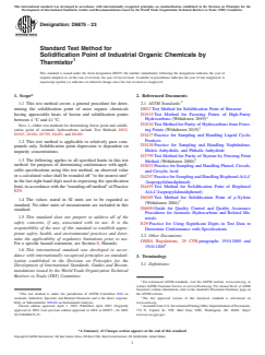 ASTM D6875-23 is a standard published by ASTM International. Its full title is "Standard Test Method for Solidification Point of Industrial Organic Chemicals by Thermistor". This standard covers: SIGNIFICANCE AND USE 5.1 This test method may be used for process control during the manufacture of organic chemicals described in Section 1, for setting specifications, for development and research work, and to determine if contamination was introduced during shipment. SCOPE 1.1 This test method covers a general procedure for determining the solidification point of most organic chemicals having appreciable heats of fusion and solidification points between 4 °C and 41 °C. Note 1: Other test methods for determining freeze point and solidification point of aromatic hydrocarbons include Test Methods D852, D1015, D1016, D3799, D4493, and D6269. 1.2 This test method is applicable to relatively pure compounds only. Solidification point depression is dependent on impurity concentrations. 1.3 The following applies to all specified limits in this test method: for purposes of determining conformance with applicable specifications using this test method, an observed value or a calculated value shall be rounded off “to the nearest unit” in the last right hand digit used in expressing the specification limit, in accordance with the “rounding-off method” of Practice E29. 1.4 The values stated in SI units are to be regarded as standard. No other units of measurement are included in this standard. 1.5 This standard does not purport to address all of the safety concerns, if any, associated with its use. It is the responsibility of the user of this standard to establish appropriate safety, health, and environmental practices and determine the applicability of regulatory limitations prior to use. For a specific hazard statement, see Section 8, Hazards. 1.6 This international standard was developed in accordance with internationally recognized principles on standardization established in the Decision on Principles for the Development of International Standards, Guides and Recommendations issued by the World Trade Organization Technical Barriers to Trade (TBT) Committee.