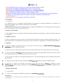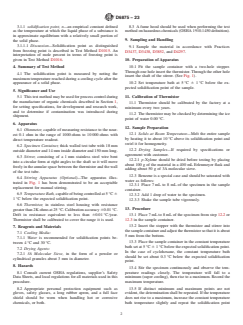 SIGNIFICANCE AND USE 5.1 This test method may be used for process control during the manufacture of organic chemicals described in Section 1, for setting specifications, for development and research work, and to determine if contamination was introduced during shipment. SCOPE 1.1 This test method covers a general procedure for determining the solidification point of most organic chemicals having appreciable heats of fusion and solidification points between 4 °C and 41 °C. Note 1: Other test methods for determining freeze point and solidification point of aromatic hydrocarbons include Test Methods D852, D1015, D1016, D3799, D4493, and D6269. 1.2 This test method is applicable to relatively pure compounds only. Solidification point depression is dependent on impurity concentrations. 1.3 The following applies to all specified limits in this test method: for purposes of determining conformance with applicable specifications using this test method, an observed value or a calculated value shall be rounded off “to the nearest unit” in the last right hand digit used in expressing the specification limit, in accordance with the “rounding-off method” of Practice E29. 1.4 The values stated in SI units are to be regarded as standard. No other units of measurement are included in this standard. 1.5 This standard does not purport to address all of the safety concerns, if any, associated with its use. It is the responsibility of the user of this standard to establish appropriate safety, health, and environmental practices and determine the applicability of regulatory limitations prior to use. For a specific hazard statement, see Section 8, Hazards. 1.6 This international standard was developed in accordance with internationally recognized principles on standardization established in the Decision on Principles for the Development of International Standards, Guides and Recommendations issued by the World Trade Organization Technical Barriers to Trade (TBT) Committee.