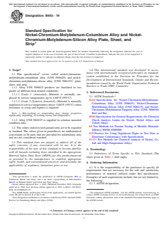 ASTM B443-19 is a technical specification published by ASTM International. Its full title is "Standard Specification for Nickel-Chromium-Molybdenum-Columbium Alloy and Nickel-Chromium-Molybdenum-Silicon Alloy Plate, Sheet, and Strip". This standard covers: ABSTRACT This specification covers rolled nickel-chromium-molybdenum-columbium alloy (UNS No. N06625) and nickel-chromium-molybdenum-silicon alloy (UNS No. N06219) plates, sheets, and strips. N06625 alloys shall be furnished in two grades of different heat treatment conditions, namely: Grade 1 (annealed); and Grade 2 (solution annealed). N06219 alloys, on the other hand, shall be furnished in solution annealed condition only. Materials shall be sampled prepared, and tested accordingly to examine their conformance to dimensional (thickness, weight, width, diameter, length, straightness, edges, squareness, and flatness), mechanical (tensile and yield strengths, and elongation), and chemical composition requirements. SCOPE 1.1 This specification2 covers rolled nickel-chromium-molybdenum-columbium alloy (UNS N06625) and nickel-chromium-molybdenum-silicon alloy (UNS N06219)3 plate, sheet, and strip. 1.1.1 Alloy UNS N06625 products are furnished in two grades of different heat-treated conditions: 1.1.1.1 Grade 1 (Annealed)—Material is normally employed in service temperatures up to 1100°F (593°C). 1.1.1.2 Grade 2 (Solution Annealed)—Material is normally employed in service temperatures above 1100°F (593°C) when resistance to creep and rupture is required. Note 1: Hot-working or reannealing may change properties significantly, depending on working history and temperatures. 1.1.2 Alloy UNS N06219 is supplied in solution annealed condition only. 1.2 The values stated in inch-pound units are to be regarded as standard. The values given in parentheses are mathematical conversions to SI units that are provided for information only and are not considered standard. 1.3 This standard does not purport to address all of the safety concerns, if any, associated with its use. It is the responsibility of the user of this standard to become familiar with all hazards including those identified in the appropriate Material Safety Data Sheet (MSDS) for this product/material as provided by the manufacturer, to establish appropriate safety, health, and environmental practices, and determine the applicability of regulatory limitations prior to use. 1.4 This international standard was developed in accordance with internationally recognized principles on standardization established in the Decision on Principles for the Development of International Standards, Guides and Recommendations issued by the World Trade Organization Technical Barriers to Trade (TBT) Committee.