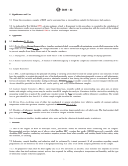 SIGNIFICANCE AND USE 5.1 Using this procedure a sample of RDF can be converted into a physical form suitable for laboratory fuel analysis. 5.2 As indicated in Test Method E791, air-dry moisture, which is determined by this procedure, is essential to the calculation of other laboratory results on an as-received basis. The air-dry moisture value is used in conjunction with the results of the residual moisture determination in Test Method E790 to calculate total sample moisture. SCOPE 1.1 This practice covers the preparation of RDF laboratory samples for analysis, the laboratory samples having been previously obtained from representative RDF samples. 1.2 The determination of the air-dry loss of the RDF is part of this preparation procedure and must be performed prior to the particle size reduction. 1.3 The practice given may also be used for other RDF types but additional sample preparation steps may be necessary prior to the application of this method. 1.4 The values stated in SI units are to be regarded as standard. Other units of measurement in parentheses in this standard are informational. 1.5 This standard does not purport to address all of the safety concerns, if any, associated with its use. It is the responsibility of the user of this standard to establish appropriate safety, health, and environmental practices and determine the applicability of regulatory limitations prior to use. Specific hazard statements are given in Section 7. 1.6 This international standard was developed in accordance with internationally recognized principles on standardization established in the Decision on Principles for the Development of International Standards, Guides and Recommendations issued by the World Trade Organization Technical Barriers to Trade (TBT) Committee.
