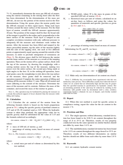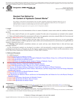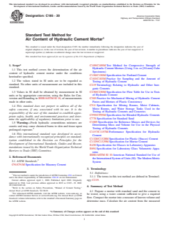 SIGNIFICANCE AND USE 5.1 The purpose of this test method is to determine whether or not the hydraulic cement under test meets the air-entraining or non-air-entraining requirements of the applicable hydraulic cement specification for which the test is being made. The air content of concrete is influenced by many factors other than the potential of the cement for air entrainment. SCOPE 1.1 This test method covers the determination of the air content of hydraulic cement mortar under the conditions hereinafter specified. 1.2 The values stated in SI units are to be regarded as standard. No other units of measurement are included in this standard. 1.3 Values in SI shall be obtained by measurement in SI units or by appropriate conversion, using the Rules for Conversion and Rounding in IEEE/ASTM SI 10, of measurements made in other units. 1.4 This standard does not purport to address all of the safety concerns, if any, associated with its use. It is the responsibility of the user of this standard to establish appropriate safety, health, and environmental practices and determine the applicability of regulatory limitations prior to use. 1.5 Warning—Fresh hydraulic cementitious mixtures are caustic and may cause chemical burns to skin and tissue upon prolonged exposure.2 1.6 This international standard was developed in accordance with internationally recognized principles on standardization established in the Decision on Principles for the Development of International Standards, Guides and Recommendations issued by the World Trade Organization Technical Barriers to Trade (TBT) Committee.