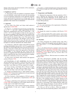 ASTM C185-20 is a standard published by ASTM International. Its full title is "Standard Test Method for Air Content of Hydraulic Cement Mortar". This standard covers: SIGNIFICANCE AND USE 5.1 The purpose of this test method is to determine whether or not the hydraulic cement under test meets the air-entraining or non-air-entraining requirements of the applicable hydraulic cement specification for which the test is being made. The air content of concrete is influenced by many factors other than the potential of the cement for air entrainment. SCOPE 1.1 This test method covers the determination of the air content of hydraulic cement mortar under the conditions hereinafter specified. 1.2 The values stated in SI units are to be regarded as standard. No other units of measurement are included in this standard. 1.3 Values in SI shall be obtained by measurement in SI units or by appropriate conversion, using the Rules for Conversion and Rounding in IEEE/ASTM SI 10, of measurements made in other units. 1.4 This standard does not purport to address all of the safety concerns, if any, associated with its use. It is the responsibility of the user of this standard to establish appropriate safety, health, and environmental practices and determine the applicability of regulatory limitations prior to use. 1.5 Warning—Fresh hydraulic cementitious mixtures are caustic and may cause chemical burns to skin and tissue upon prolonged exposure.2 1.6 This international standard was developed in accordance with internationally recognized principles on standardization established in the Decision on Principles for the Development of International Standards, Guides and Recommendations issued by the World Trade Organization Technical Barriers to Trade (TBT) Committee.