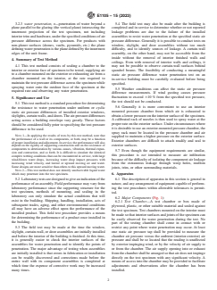 • Field Test Procedures: It details the process for creating pressure differentials across the test specimen and uniformly applying water spray to exposed surfaces and edges.