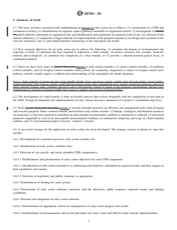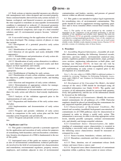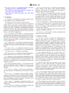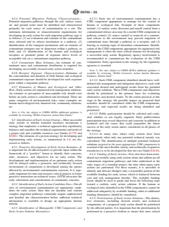 SIGNIFICANCE AND USE 5.1 This guide is intended to provide a systematic approach for the application and execution of early actions for purposes of remediating both hazardous and non-hazardous contamination. Iterative development of a CSM is fundamental to the use of this guide. 5.2 Anticipated users of this guide are owners or operators at sites of environmental contamination; technical professionals involved in the field of environmental site characterization and remediation; environmental regulators, property owners, employees, and residents adjacent to sites of environmental contamination; and lenders, sureties, and persons of general interest within an affected community. 5.3 This guide is not intended to replace legal requirements for remediating sites of environmental contamination. This guide should be used to supplement existing regulatory guidance and to focus remedial efforts toward final remedy solutions. Note 2: The quality of the result produced by this standard is dependent on the competence of the personnel performing it, and the suitability of the equipment and facilities used. Agencies that meet the criteria of Practice D3740 are generally considered capable of competent and objective testing/sampling/inspection/etc. Users of this standard are cautioned that compliance with Practice D3740 does not in itself assure reliable results. Reliable results depend on many factors; Practice D3740 provides a means of evaluating some of those factors. SCOPE 1.1 The purpose of this guide is to assist practitioners in the development, selection, design, and implementation of interim, short-term, or early action remedies undertaken at sites of waste contamination for the purpose of managing, controlling, or reducing risk posed by environmental site contamination. Early action remedies and strategies are applicable to the management of other regulatory processes (for example, state underground storage tank (UST) programs are equally applicable) in addition to the Comprehensive Environmental Response, Compensation and Liability Act (CERCLA)/National Oil and Hazardous Substances Pollution Contigency Plan (NCP) process. This guide identifies and describes a standard process, technical requirements, information needs, benefits, and strategy for early actions. 1.2 This guide is applicable to both nonhazardous and hazardous sites of contamination as defined by CERCLA as amended by the Superfund Amendments and Reauthorization Act of 1986 (SARA) and the Resource Conservation and Recovery Act (RCRA) as amended by the Hazardous and Solid Waste Amendments (HSWA) of 1986. 1.3 To the extent that this guide may be used for hazardous materials operations, it does not address the applicability of regulatory limitations and local requirements. 1.4 This guide offers an organized collection of information or a series of options and does not recommend a specific course of action. This document cannot replace education or experience and should be used in conjunction with professional judgment. Not all aspects of this guide may be applicable in all circumstances. This ASTM standard is not intended to represent or replace the standard of care by which the adequacy of a given professional service must be judged, nor should this document be applied without consideration of a project’s many unique aspects. The word “Standard” in the title of this document means only that the document has been approved through the ASTM consensus process. 1.5 This standard does not purport to address all of the safety concerns, if any, associated with its use. It is the responsibility of the user of this standard to establish appropriate safety, health, and environmental practices and determine the applicability of regulatory limitations prior to use. 1.6 This international standard was developed in accordance with internationally recognized principles on standardization established in the Decision on Principles for the Development...