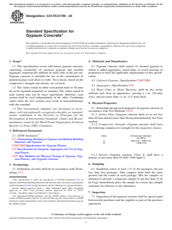 ASTM C317/C317M-24 is a technical specification published by ASTM International. Its full title is "Standard Specification for Gypsum Concrete". This standard covers: ABSTRACT This specification covers mill-mixed gypsum concrete, consisting essentially of calcined gypsum and suitable aggregate, requiring the addition of water only at the job site. Gypsum concrete is intended for use in the construction of poured-in-place roof decks or slabs. Two classes, based on the compressive strength and density, are covered. Gypsum concrete shall consist of calcined gypsum to which are added aggregates, wood chips, or wood shavings in proportion to meet the applicable requirements of this specification. Test method in this specification shall be performed in order to determine the physical properties of the gypsum concrete. Setting time is determined by the Vicat method. SCOPE 1.1 This specification covers mill-mixed gypsum concrete, consisting essentially of calcined gypsum and suitable aggregate, requiring the addition of water only at the job site. Gypsum concrete is intended for use in the construction of poured-in-place roof decks or slabs. Two classes, based on the compressive strength and density, are covered. 1.2 The values stated in either inch-pound units or SI units are to be regarded separately as standard. The values stated in each system may not be exact equivalents; therefore, each system shall be used independently of the other. Combining values from the two systems may result in nonconformance with the standard. 1.3 This international standard was developed in accordance with internationally recognized principles on standardization established in the Decision on Principles for the Development of International Standards, Guides and Recommendations issued by the World Trade Organization Technical Barriers to Trade (TBT) Committee.