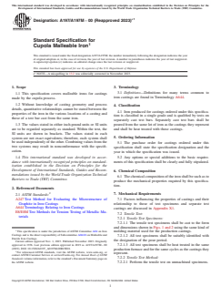 ASTM A197/A197M-00(2023)e1, titled "Standard Specification for Cupola Malleable Iron," is an international standard developed by ASTM International. This specification defines the requirements for malleable iron castings produced by the cupola process. The standard outlines the necessary chemical composition, mechanical, and microstructural properties to ensure that castings meet quality, performance, and reliability expectations for varied industrial applications. Strict guidelines for tensile testing, visual inspection, and heat treatment are included to ensure castings exhibit consistent, sound material quality.