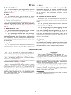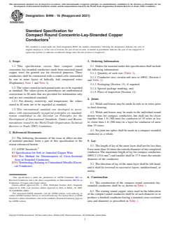 ABSTRACT This specification covers bare compact round concentric-lay-stranded conductors made from uncoated round copper wires for general use for electrical purposes. Welds and brazes shall be made in rods and wires prior to final drawing. The conductors shall conform to the required construction values of nominal cross-sectional area, diameter, mass per unit length and dc electrical resistance. Tests for the physical and electrical properties of wires composing the conductors shall be made before stranding. SCOPE 1.1 This specification covers bare compact round concentric-lay-stranded conductors made from uncoated round copper wires for general use for electrical purposes. These conductors shall be constructed with a central core surrounded by one or more layers of helically laid compacted wires (Explanatory Note 1 and Note 2). 1.2 The values stated in inch-pound units are to be regarded as standard. The values given in parentheses are mathematical conversions to SI units that are provided for information only and are not considered standard. 1.2.1 For density, resistivity, and temperature, the values stated in SI units are to be regarded as standard. 1.3 This international standard was developed in accordance with internationally recognized principles on standardization established in the Decision on Principles for the Development of International Standards, Guides and Recommendations issued by the World Trade Organization Technical Barriers to Trade (TBT) Committee.