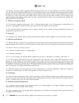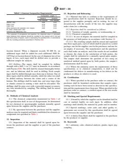 ASTM B237-20 is a technical specification published by ASTM International. Its full title is "Standard Specification for Refined Antimony". This standard covers: ABSTRACT This specification covers refined antimony in ingot, pig, or cake form. Refined antimony shall be supplied in commercial standard forms in Grade A and Grade B. The grades of refined antimony shall be produced by any smelting and refining process from ore or recycled materials to meet the chemical requirements of this specification. The refined antimony shall conform to the required chemical composition of arsenic, sulfur, lead, and others. The antimony shall be reasonably free from surface corrosion or adherent foreign material. SCOPE 1.1 This specification covers refined antimony in ingot, pig, or cake form. 1.2 The values stated in inch-pound units are to be regarded as standard. The values given in parentheses are mathematical conversions to SI units that are provided for information only and are not considered standard. 1.3 This standard does not purport to address all of the safety concerns, if any, associated with its use. It is the responsibility of the user of this standard to become familiar with all hazards including those identified in the appropriate Safety Data Sheet (SDS) for this product/material as provided by the manufacturer, to establish appropriate safety, health, and environmental practices, and determine the applicability of regulatory limitations prior to use. 1.4 This international standard was developed in accordance with internationally recognized principles on standardization established in the Decision on Principles for the Development of International Standards, Guides and Recommendations issued by the World Trade Organization Technical Barriers to Trade (TBT) Committee.