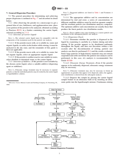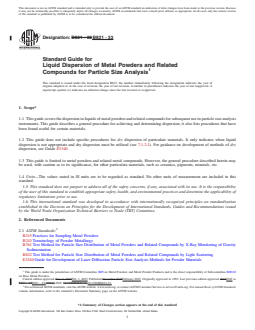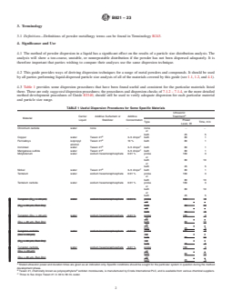 SIGNIFICANCE AND USE 4.1 The method of powder dispersion in a liquid has a significant effect on the results of a particle size distribution analysis. The analysis will show a too-coarse, unstable, or nonrepeatable distribution if the powder has not been dispersed adequately. It is therefore important that parties wishing to compare their analyses use the same dispersion technique. 4.2 This guide provides ways of deriving dispersion techniques for a range of metal powders and compounds. It should be used by all parties performing liquid-dispersed particle size analysis of all of the materials covered by this guide (see 1.1, 1.2, and 4.1). 4.3 Table 1 provides some dispersion procedures that have been found useful and consistent for the particular materials listed there. These are only suggested dispersion procedures; the procedures and dispersion checks of 7.1.2 – 7.1.4, or the more detailed method development procedures of Guide E3340, should still be used to verify adequate dispersion for each particular material and particle size range. (A) Stated ultrasonic power and duration times are given as an indication only. Specific conditions should be sought for the particular system in question during the method development phase.(B) Tween 21, chemically known as polyoxyethylene6 sorbitan monolaurate, is manufactured by Croda International PLC, and is available from various chemical suppliers.(C) Three to five drops Tween 21 in 30 to 50 mL water. 4.4 This guide should be used in the preparation of powders for use in Test Methods B761 and B822 and other procedures that analyze metal powder particle size distributions in liquid-dispersed systems. SCOPE 1.1 This guide covers the dispersion in liquids of metal powders and related compounds for subsequent use in particle size analysis instruments. This guide describes a general procedure for achieving and determining dispersion; it also lists procedures that have been found useful for certain materials. 1.2 This guide does not include specific procedures for dry dispersion of particulate materials. It only indicates when liquid dispersion is not appropriate and dry dispersion must be utilized (see 7.1.2.1). For guidance on development of methods of dry dispersion, see Guide E3340. 1.3 This guide is limited to metal powders and related metal compounds. However, the general procedure described herein may be used, with caution as to its significance, for other particulate materials, such as ceramics, pigments, minerals, etc. 1.4 Units—The values stated in SI units are to be regarded as standard. No other units of measurement are included in this standard. 1.5 This standard does not purport to address all of the safety concerns, if any, associated with its use. It is the responsibility of the user of this standard to establish appropriate safety, health, and environmental practices and determine the applicability of regulatory limitations prior to use. 1.6 This international standard was developed in accordance with internationally recognized principles on standardization established in the Decision on Principles for the Development of International Standards, Guides and Recommendations issued by the World Trade Organization Technical Barriers to Trade (TBT) Committee.