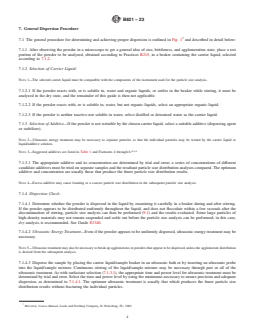 4.3 Table 1 provides some dispersion procedures that have been found useful and consistent for the particular materials listed there. These are only suggested dispersion procedures; the procedures and dispersion checks of 7.1.2 – 7.1.4, or the more detailed method development procedures of Guide E3340, should still be used to verify adequate dispersion for each particular material and particle size range. (A) Stated ultrasonic power and duration times are given as an indication only. Specific conditions should be sought for the particular system in question during the method development phase.(B) Tween 21, chemically known as polyoxyethylene6 sorbitan monolaurate, is manufactured by Croda International PLC, and is available from various chemical suppliers.(C) Three to five drops Tween 21 in 30 to 50 mL water.