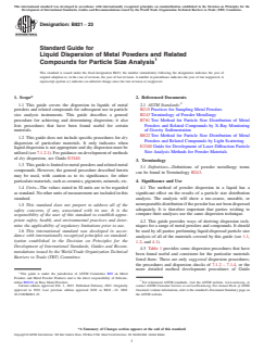 ASTM B821-23 is a guide published by ASTM International. Its full title is "Standard Guide for Liquid Dispersion of Metal Powders and Related Compounds for Particle Size Analysis". This standard covers: SIGNIFICANCE AND USE 4.1 The method of powder dispersion in a liquid has a significant effect on the results of a particle size distribution analysis. The analysis will show a too-coarse, unstable, or nonrepeatable distribution if the powder has not been dispersed adequately. It is therefore important that parties wishing to compare their analyses use the same dispersion technique. 4.2 This guide provides ways of deriving dispersion techniques for a range of metal powders and compounds. It should be used by all parties performing liquid-dispersed particle size analysis of all of the materials covered by this guide (see 1.1, 1.2, and 4.1). 4.3 Table 1 provides some dispersion procedures that have been found useful and consistent for the particular materials listed there. These are only suggested dispersion procedures; the procedures and dispersion checks of 7.1.2 – 7.1.4, or the more detailed method development procedures of Guide E3340, should still be used to verify adequate dispersion for each particular material and particle size range. (A) Stated ultrasonic power and duration times are given as an indication only. Specific conditions should be sought for the particular system in question during the method development phase.(B) Tween 21, chemically known as polyoxyethylene6 sorbitan monolaurate, is manufactured by Croda International PLC, and is available from various chemical suppliers.(C) Three to five drops Tween 21 in 30 to 50 mL water. 4.4 This guide should be used in the preparation of powders for use in Test Methods B761 and B822 and other procedures that analyze metal powder particle size distributions in liquid-dispersed systems. SCOPE 1.1 This guide covers the dispersion in liquids of metal powders and related compounds for subsequent use in particle size analysis instruments. This guide describes a general procedure for achieving and determining dispersion; it also lists procedures that have been found useful for certain materials. 1.2 This guide does not include specific procedures for dry dispersion of particulate materials. It only indicates when liquid dispersion is not appropriate and dry dispersion must be utilized (see 7.1.2.1). For guidance on development of methods of dry dispersion, see Guide E3340. 1.3 This guide is limited to metal powders and related metal compounds. However, the general procedure described herein may be used, with caution as to its significance, for other particulate materials, such as ceramics, pigments, minerals, etc. 1.4 Units—The values stated in SI units are to be regarded as standard. No other units of measurement are included in this standard. 1.5 This standard does not purport to address all of the safety concerns, if any, associated with its use. It is the responsibility of the user of this standard to establish appropriate safety, health, and environmental practices and determine the applicability of regulatory limitations prior to use. 1.6 This international standard was developed in accordance with internationally recognized principles on standardization established in the Decision on Principles for the Development of International Standards, Guides and Recommendations issued by the World Trade Organization Technical Barriers to Trade (TBT) Committee.