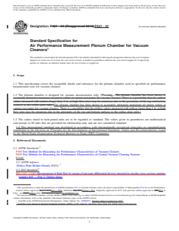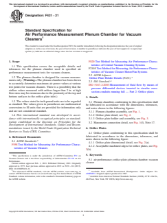 ASTM F431-21 is a technical specification published by ASTM International. Its full title is "Standard Specification for Air Performance Measurement Plenum Chamber for Vacuum Cleaners". This standard covers: ABSTRACT This specification covers the acceptable design details for the plenum chamber used in specified air performance measurement tests for vacuum cleaners. Plenum chambers conforming to this specification shall be fabricated in accordance with the dimensions, tolerances, and notes indicated for the following components: plenum chamber assembly; orifice plate; orifice plate holder and assembly; manometer connection; and acceptable machined edges for orifice plates. SCOPE 1.1 This specification covers the acceptable details and tolerances for the plenum chamber used in specified air performance measurement tests for vacuum cleaners. 1.2 The plenum chamber is designed for vacuum measurements only. (Warning—The plenum chamber has been shown to accurately determine maximum air power values at various test points for vacuum cleaners. There is a possibility that the airflow values measured with orifices larger than 2 in. at high flow rates may be erroneous due to the proximity of the top and bottom surfaces to the orifice plate inlet.) 1.3 The values stated in inch-pound units are to be regarded as standard. The values given in parentheses are mathematical conversions to SI units that are provided for information only and are not considered standard. 1.4 This international standard was developed in accordance with internationally recognized principles on standardization established in the Decision on Principles for the Development of International Standards, Guides and Recommendations issued by the World Trade Organization Technical Barriers to Trade (TBT) Committee.