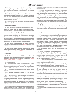 SIGNIFICANCE AND USE 4.1 This practice is intended to provide the user with a process to obtain data on package performance when a packaged product is subjected to shock. These measures can be used to quantify or qualify a package system. 4.2 Data from this practice may provide a measure of a package's ability to mitigate the various levels of shipping shock or impact hazards. These measures may be used to prescribe a mode of shipping and handling that will not induce damage to the packaged product or to define the required levels of protection that must be provided by its packaging. 4.3 This practice could potentially be used in conjunction with the data derived from Test Method D3332 (Method B) for optimizing cushion design. 4.4 This practice obtains data at the interface of the product and package (coupled) or element response, depending on the intent of the user (see 10.1 and 10.1.1). SCOPE 1.1 This practice covers methods for obtaining measured shock responses using instrumentation for an actual or simulated product package system when subjected to defined shock inputs to measure package performance. 1.2 This practice establishes methods for obtaining measured shock data for use with shock and impact test methods. It is not intended as a substitute for performance testing of shipping containers and systems such as Practice D4169. 1.3 This practice will address acceleration measuring techniques. Other ways of measuring shock impacts, such as high speed video, are not covered by this practice. 1.4 This standard does not purport to address all of the safety concerns, if any, associated with its use. It is the responsibility of the user of this standard to establish appropriate safety, health, and environmental practices and determine the applicability of regulatory limitations prior to use. 1.5 This international standard was developed in accordance with internationally recognized principles on standardization established in the Decision on Principles for the Development of International Standards, Guides and Recommendations issued by the World Trade Organization Technical Barriers to Trade (TBT) Committee.
