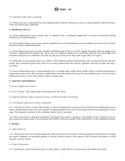 SIGNIFICANCE AND USE 4.1 Linear displacement sensor systems play an important role in orthopedic applications to measure micromotion during simulated use of joint prostheses. 4.2 Linear displacement sensor systems must be calibrated for use in the laboratory to ensure reliable conversions of the system’s electrical output to engineering units. 4.3 Linear displacement sensor systems should be calibrated before initial use, at least annually thereafter, after any change in the electronic configuration that employs the sensor, after any significant change in test conditions using the sensor that differ from conditions during the last calibration, and after any physical action on the sensor that might affect its response. 4.4 Verification of sensor performance in accordance with calibration should be performed on a per use basis both before and after testing. Such verification can be done with a less accurate standard than that used for calibration, and may be done with only a few points. 4.5 Linear displacement sensor systems generally have a working range within which voltage output is linearly proportional to displacement of the sensor. This procedure is applicable to the linear range of the sensor. Recommended practice is to use the linear displacement sensor system only within its linear working range. SCOPE 1.1 This practice covers the procedures for calibration of linear displacement sensors and their corresponding power supply, signal conditioner, and data acquisition systems (linear displacement sensor systems) for use in measuring micromotion. It covers any sensor used to measure displacement that gives an electrical voltage output that is linearly proportional to displacement. This includes, but is not limited to, linear variable differential transformers (LVDTs) and differential variable reluctance transducers (DVRTs). 1.2 This calibration procedure is used to determine the relationship between output of the linear displacement sensor system and displacement. This relationship is used to convert readings from the linear displacement sensor system into engineering units. 1.3 This calibration procedure is also used to determine the error of the linear displacement sensor system over the range of its use. 1.4 The values stated in SI units are to be regarded as standard. No other units of measurement are included in this standard. 1.5 This standard does not purport to address all of the safety concerns, if any, associated with its use. It is the responsibility of the user of this standard to establish appropriate safety, health, and environmental practices and determine the applicability of regulatory limitations prior to use. 1.6 This international standard was developed in accordance with internationally recognized principles on standardization established in the Decision on Principles for the Development of International Standards, Guides and Recommendations issued by the World Trade Organization Technical Barriers to Trade (TBT) Committee.