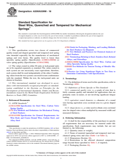 1.1 This specification covers two classes of commercial quality round and shaped quenched and tempered steel spring wire intended especially for the manufacture of mechanical springs and wire forms. The quality level is lower than specialty spring quality (Specification A1000/A1000M) or valve spring quality (Specification A230/A230M).