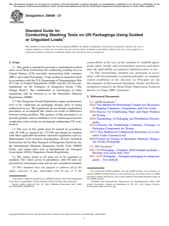 ASTM D8409-21 is a guide published by ASTM International. Its full title is "Standard Guide for Conducting Stacking Tests on UN Packagings Using Guided or Unguided Loads". This standard covers: SIGNIFICANCE AND USE 4.1 This guide is intended to provide a standardized method and a set of basic instructions for performing stack testing on UN packaging designs using either guided or unguided top loads. This guide provides the suggested minimum information that should be documented when conducting stacking test and provides information for recommended equipment. 4.2 All packaging design types other than bags must be subjected to a stacking test. Packagings subject to the stacking test must be capable of withstanding a superimposed top load of a specified minimum mass for a specified period of time without failure as these parameters are defined in the regulations. The test is not intended to determine the absolute top load capability of a packaging. Note 1: When quantification of box compression strength is desired for determining stacking strength or for design purposes use Test Method D642 and conditioning as recommended in 4.5. 4.3 Design qualification testing procedures are intended, as explicitly stated in the HMR, to be the minimum performance capability levels for packaging manufactured to transport Hazardous Materials under conditions normally incident to transportation. 4.4 The HMR tests are designed to be gross package capability evaluations that can be performed in a similar manner in all parts of the world, but under circumstances with some variance in test facility capabilities. This is an intentional feature of the test designs and protocols. The focus of HMR testing is not the determination of quantifiable, comparison data to allow for analytical evaluation. 4.5 It is recommended that facilities performing the HMR tests consult the guidance on conditioning in the relevant ASTM documents for any particular packaging material as applicable. The following conditioning documents, Practices D4332 and D685, are commonly used. SCOPE 1.1 This guide is intended to provide a standardized method and a set of basic instructions for conducting stacking tests on United Nations (UN) non-bulk, intermediate bulk container (IBC), and Large Packagings. Using guided or unguided loads in accordance with the U.S. Department of Transportation Title 49 Code of Federal Regulations (CFR) and the UN Recommendations on the Transport of Dangerous Goods (“The Orange Book”). The combination or interchange of these regulations will be referred to as the Hazardous Material Regulations (HMR). 1.2 The Dangerous Goods Regulations require performance tests to be conducted on packaging designs prior to being authorized for use. The regulations do not include standardized procedures to accomplish this which can result in differences between testing facilities. The purpose of this document is to provide guidance and to establish a set of common practices for conducting stack testing on packagings undergoing UN certification. 1.3 The user of this guide must be trained in accordance with 49 CFR as required by 172.700 and should be familiar with other applicable hazardous materials regulations such as; International Civil Aviation Organization (ICAO) Technical Instructions for the Safe Transport of Dangerous Goods by Air, the International Maritime Dangerous Goods Code (IMDG Code), and carrier rules such as International Air Transport Association (IATA) Dangerous Goods Regulations. 1.4 The values stated in SI units are to be regarded as standard. The values given in parentheses after SI units are provided for information only and are not considered standard. 1.5 This standard does not purport to address all of the safety concerns, if any, associated with its use. It is the responsibility of the user of this standard to establish appropriate safety, health, and environmental practices and determine the applicability of regulatory limitations prior to use. 1.6 This international standard was developed in accordance with internationally recognized principles on standardization established in the Decision on...