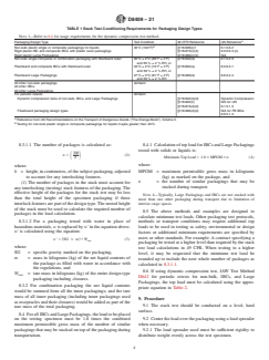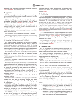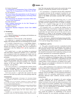 SIGNIFICANCE AND USE 4.1 This guide is intended to provide a standardized method and a set of basic instructions for performing stack testing on UN packaging designs using either guided or unguided top loads. This guide provides the suggested minimum information that should be documented when conducting stacking test and provides information for recommended equipment. 4.2 All packaging design types other than bags must be subjected to a stacking test. Packagings subject to the stacking test must be capable of withstanding a superimposed top load of a specified minimum mass for a specified period of time without failure as these parameters are defined in the regulations. The test is not intended to determine the absolute top load capability of a packaging. Note 1: When quantification of box compression strength is desired for determining stacking strength or for design purposes use Test Method D642 and conditioning as recommended in 4.5. 4.3 Design qualification testing procedures are intended, as explicitly stated in the HMR, to be the minimum performance capability levels for packaging manufactured to transport Hazardous Materials under conditions normally incident to transportation. 4.4 The HMR tests are designed to be gross package capability evaluations that can be performed in a similar manner in all parts of the world, but under circumstances with some variance in test facility capabilities. This is an intentional feature of the test designs and protocols. The focus of HMR testing is not the determination of quantifiable, comparison data to allow for analytical evaluation. 4.5 It is recommended that facilities performing the HMR tests consult the guidance on conditioning in the relevant ASTM documents for any particular packaging material as applicable. The following conditioning documents, Practices D4332 and D685, are commonly used. SCOPE 1.1 This guide is intended to provide a standardized method and a set of basic instructions for conducting stacking tests on United Nations (UN) non-bulk, intermediate bulk container (IBC), and Large Packagings. Using guided or unguided loads in accordance with the U.S. Department of Transportation Title 49 Code of Federal Regulations (CFR) and the UN Recommendations on the Transport of Dangerous Goods (“The Orange Book”). The combination or interchange of these regulations will be referred to as the Hazardous Material Regulations (HMR). 1.2 The Dangerous Goods Regulations require performance tests to be conducted on packaging designs prior to being authorized for use. The regulations do not include standardized procedures to accomplish this which can result in differences between testing facilities. The purpose of this document is to provide guidance and to establish a set of common practices for conducting stack testing on packagings undergoing UN certification. 1.3 The user of this guide must be trained in accordance with 49 CFR as required by 172.700 and should be familiar with other applicable hazardous materials regulations such as; International Civil Aviation Organization (ICAO) Technical Instructions for the Safe Transport of Dangerous Goods by Air, the International Maritime Dangerous Goods Code (IMDG Code), and carrier rules such as International Air Transport Association (IATA) Dangerous Goods Regulations. 1.4 The values stated in SI units are to be regarded as standard. The values given in parentheses after SI units are provided for information only and are not considered standard. 1.5 This standard does not purport to address all of the safety concerns, if any, associated with its use. It is the responsibility of the user of this standard to establish appropriate safety, health, and environmental practices and determine the applicability of regulatory limitations prior to use. 1.6 This international standard was developed in accordance with internationally recognized principles on standardization established in the Decision on...