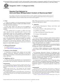 ASTM D4370-01(2023), titled Standard Test Methods for Acid and Base Milliequivalent Content of Electrocoat Bath, provides standardized procedures for determining the acid and base milliequivalent content in both anodic and cathodic electrocoat (e-coat) baths and their ultrafiltrates. These test methods ensure reliable measurement of titratable acidic and alkaline components, which is essential for research, production, and process control in electrocoating applications. The standard emphasizes the use of SI units and is developed in accordance with international standardization principles.