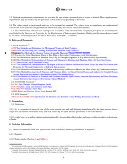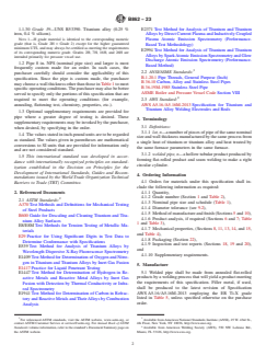 ASTM B862-23 is a technical specification published by ASTM International. Its full title is "Standard Specification for Titanium and Titanium Alloy Welded Pipe". This standard covers: ABSTRACT This specification covers the requirements for 33 grades of titanium and titanium alloy welded pipe intended for general corrosion resisting and elevated temperature service. Welded pipe shall be made from annealed flat-rolled products by a welding process. Welded pipe may be further reduced by cold working or hot working. Grades 1, 2, 2 H, 7, 7H, 11,13, 14, 16, 16H, 17, 26H, 33, and 37 shall be furnished as welded or annealed. Grades 3, 12, 15, and 34 shall be furnished as annealed. Grade 5, 23, 24, 25, 35 shall be furnished as annealed, or aged. Grade 9, 18, 38 shall be furnished as annealed. Grade 19, 20, 21 shall be furnished as solution treated, or solution treated and aged. The materials shall conform to the required chemical composition for nitrogen, carbon, hydrogen, iron, oxygen, aluminum, vanadium, tin, ruthenium, palladium, cobalt, molybdenum, chromium, nickel, niobium, zirconium, silicon, and titanium. They shall also conform to the required mechanical propetries such as tensile strength, yield strength, and elongation. SCOPE 1.1 This specification covers the requirements for 33 grades of titanium and titanium alloy welded pipe intended for general corrosion resisting and elevated temperature service as follows: 1.1.1 Grade 1—UNS R50250. Unalloyed titanium, 1.1.2 Grade 2—UNS R50400. Unalloyed titanium, 1.1.2.1 Grade 2H—UNS R50400. Unalloyed titanium (Grade 2 with 58 ksi (400 MPa) minimum UTS), 1.1.3 Grade 3—UNS R50550. Unalloyed titanium, 1.1.4 Grade 5—UNS R56400. Titanium alloy (6 % aluminum, 4 % vanadium), 1.1.5 Grade 7—UNS R52400. Unalloyed titanium plus 0.12 % to 0.25 % palladium, 1.1.5.1 Grade 7H—UNS R52400. Unalloyed titanium plus 0.12 % to 0.25 % palladium (Grade 7 with 58 ksi (400 MPa) minimum UTS), 1.1.6 Grade 9—UNS R56320. Titanium alloy (3 % aluminum, 2.5 % vanadium), 1.1.7 Grade 11—UNS R52250. Unalloyed titanium plus 0.12 % to 0.25 % palladium, 1.1.8 Grade 12—UNS R53400. Titanium alloy (0.3 % molybdenum, 0.8 % nickel), 1.1.9 Grade 13—UNS R53413. Titanium alloy (0.5 % nickel, 0.05 % ruthenium), 1.1.10 Grade 14—UNS R53414. Titanium alloy (0.5 % nickel, 0.05 % ruthenium), 1.1.11 Grade 15—UNS R53415. Titanium alloy (0.5 % nickel, 0.05 % ruthenium), 1.1.12 Grade 16—UNS R52402. Unalloyed titanium plus 0.04 % to 0.08 % palladium, 1.1.12.1 Grade 16H—UNS R52402. Unalloyed titanium plus 0.04 % to 0.08 % palladium (Grade 16 with 58 ksi (400 MPa) minimum UTS), 1.1.13 Grade 17—UNS R52252. Unalloyed titanium plus 0.04 % to 0.08 % palladium, 1.1.14 Grade 18—UNS R56322. Titanium alloy (3 % aluminum, 2.5 % vanadium plus 0.04 % to 0.08 % palladium), 1.1.15 Grade 19—UNS R58640. Titanium alloy (3 % aluminum, 8 % vanadium, 6 % chromium, 4 % zirconium, 4 % molybdenum), 1.1.16 Grade 20—UNS R58645. Titanium alloy (3 % aluminum, 8 % vanadium, 6 % chromium, 4 % zirconium, 4 % molybdenum) plus 0.04 % to 0.08 % palladium, 1.1.17 Grade 21—UNS R58210. Titanium alloy (15 % molybdenum, 3 % aluminum, 2.7 % niobium, 0.25 % silicon), 1.1.18 Grade 23—UNS R56407. Titanium alloy (6 % aluminum, 4 % vanadium, extra low interstitial, ELI), 1.1.19 Grade 24—UNS R56405. Titanium alloy (6 % aluminum, 4 % vanadium) plus 0.04 % to 0.08 % palladium, 1.1.20 Grade 25—UNS R56403. Titanium alloy (6 % aluminum, 4 % vanadium) plus 0.3 % to 0.8 % nickel and 0.04 % to 0.08 % palladium, 1.1.21 Grade 26—UNS R52404. Unalloyed titanium plus 0.08 % to 0.14 % ruthenium, 1.1.21.1 Grade 26H—UNS R52404. Unalloyed titanium plus 0.08 % to 0.14 % ruthenium (Grade 26 with 58 ksi (400 MPa) minimum UTS), 1.1.22 Grade 27—UNS R52254. Unalloyed titanium plus 0.08 % to 0.14 % ruthenium, 1.1.23 Grade 28—UNS R56323. Titanium alloy (3 % aluminum, 2.5 % vanadium) plus 0.08 % to 0.14 % ruthenium, 1.1.24 Grade 29—UNS R56404. Titanium alloy (6 % aluminum, 4 % vanadium with extra low interstitial elements (ELI)) plus 0.08 % to 0.14 % ruthenium, 1.1.25 Grade 33—UNS R53442. Titaniu...