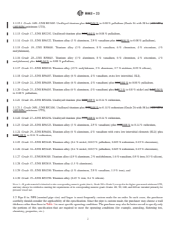 1.1 This specification covers the requirements for 33 grades of titanium and titanium alloy welded pipe intended for general corrosion resisting and elevated temperature service as follows: