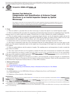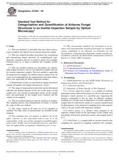 SIGNIFICANCE AND USE 5.1 This test method is used to estimate and categorize the number and type of fungal structures present on an inertial impactor sample. 5.2 Fungal structures are identified and quantified regardless of whether they would or would not grow in culture. 5.3 It must be emphasized that the detector in this test method is the analyst, and therefore results are subjective, depending on the experience, training, qualification, and mental and optical fatigue of the analyst. SCOPE 1.1 This test method is a procedure that uses direct microscopy to analyze the deposit on an inertial impaction sample. 1.2 This test method describes procedures for categorizing and enumerating fungal structures by morphological type. Typically, categories may be as small as genus (for example, Cladosporium) or as large as phylum (for example, basidiospores). 1.3 This test method contains two procedures for enumerating fungal structures: one for slit impaction samples and one for circular impaction samples. This test method is applicable for impaction air samples, for which a known volume of air (at a rate as recommended by the manufacturer) has been drawn, and is also applicable for blank impaction samples. 1.4 Enumeration results are presented in fungal structures/sample (fs/sample) and fungal structures/m3 (fs/m3). 1.5 The range of enumeration results that can be determined with this test method depends on the size of the spores on the sample trace, the amount of particulate matter on the sample trace, the percentage of the sample trace counted, and the volume of air sampled. 1.6 This test method addresses only the analysis of samples. The sampling process and interpretation of results is outside the scope of this test method. 1.7 The values stated in SI units are to be regarded as standard. No other units of measurement are included in this standard. 1.8 This standard does not purport to address all of the safety concerns, if any, associated with its use. It is the responsibility of the user of this standard to establish appropriate safety, health, and environmental practices and determine the applicability of regulatory limitations prior to use. 1.9 This international standard was developed in accordance with internationally recognized principles on standardization established in the Decision on Principles for the Development of International Standards, Guides and Recommendations issued by the World Trade Organization Technical Barriers to Trade (TBT) Committee.