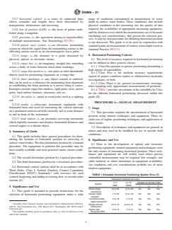 SIGNIFICANCE AND USE 5.1 This guide is intended to provide instructions for the selection of horizontal positioning equipment under a wide range of conditions encountered in measurement of water depth in surface water bodies. These conditions, that include physical conditions at the measuring site, the quality of data required, the availability of appropriate measuring equipment, and the distances over which the measurements are to be made (including cost considerations), that govern the selection process. A step-by-step procedure for obtaining horizontal position is not discussed. This guide is to be used in conjunction with standard guide on measurement of surface water depth (such as standard Practice D5173.) SCOPE 1.1 This guide covers the selection of procedures commonly used to establish a measurement of horizontal position during investigations of surface water bodies that are as follows: Sections Procedure A—Manual Measurement 7 to 12 Procedure B—Optical Measurement 13 to 17 Procedure C—Electronic Measurement 18 to 27 1.1.1 The narrative specifies horizontal positioning terminology and describes manual, optical, and electronic measuring equipment and techniques. 1.2 The references cited contain information that may help in the design of a high quality measurement program. 1.3 The information provided on horizontal positioning is descriptive in nature and not intended to endorse any particular item of manufactured equipment or procedure. 1.4 This guide pertains to determining horizontal position of a depth measurement in quiescent or low velocity flow. 1.5 The values stated in inch-pound units are to be regarded as standard. The values given in parentheses are mathematical conversions to SI units that are provided for information only and are not considered standard. 1.6 This standard does not purport to address all of the safety concerns, if any, associated with its use. It is the responsibility of the user of this standard to establish appropriate safety, health, and environmental practices and determine the applicability of regulatory limitations prior to use. 1.7 This international standard was developed in accordance with internationally recognized principles on standardization established in the Decision on Principles for the Development of International Standards, Guides and Recommendations issued by the World Trade Organization Technical Barriers to Trade (TBT) Committee.