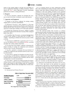 SIGNIFICANCE AND USE 5.1 A significant feature of this practice is the ability to survey coating rheology over a broad range of shear rates with the same bench viscometers and test protocol that paint formulators and paint quality control (QC) analysts routinely use. By using this procedure, measurement of the shear rheology of a coating is possible without using an expensive laboratory rheometer, and performance predictions can be made based on those measurements. 5.2 Low-Shear Viscosity (LSV)—The determination of low-shear viscosity in this practice can be used to predict the relative “in-can” performance of coatings for their ability to suspend pigment or prevent syneresis, or both. The LSV can also predict relative performance for leveling and sag resistance after application by roll, brush or spray. Fig. 1 shows the predictive low-shear viscosity relationships for several coatings properties. FIG. 1 Low Shear Viscosity (LSV) 5.3 Mid-Shear Viscosity (MSV)—The determination of MSV (coating consistency) in this practice is often the first viscosity obtained. This viscosity reflects the coatings resistance to flow on mixing, pouring, pumping, or hand stirring. Architectural coatings nearly always have a target specification for mid-shear viscosity, which is usually obtained by adjusting the level of thickener in the coating. Consequently, mid-shear viscosity is ideally a constant for a given series of coatings being tested to provide meaningful comparisons of low-shear and high-shear viscosity. With viscosities at the same KU value, MSV can also be used to obtain the relative Mid-Shear Thickener Efficiency (MSTE) of different thickeners in the same coating expressed as lb thickener/100 gal wet coating or g thickener/L wet coating. 5.4 High-Shear Viscosity (HSV)—High-shear viscosity in this practice is a measure of the coatings resistance to flow on application by brush or roller, which is often referred to as brush-drag or rolling resistance respectively. This viscosity rela... SCOPE 1.1 This practice describes a popular industry protocol for the rheological characterization of waterborne architectural coatings using three commonly used rotational bench viscometers. Each viscometer operates in a different shear rate regime for determination of coating viscosity at low shear rate, mid shear rate, and at high shear rate respectively as defined herein. General guidelines are provided for predicting some coating performance properties from the viscosity measurements made. With appropriate correlations and subsequent modification of the performance guidelines, this practice has potential for characterization of other types of aqueous and non-aqueous coatings. 1.2 The values in common viscosity units (Krebs Units, KU and Poise, P) are to be regarded as standard. 1.3 This standard does not purport to address all of the safety concerns, if any, associated with its use. It is the responsibility of the user of this standard to establish appropriate safety, health, and environmental practices and determine the applicability of regulatory limitations prior to use. 1.4 This international standard was developed in accordance with internationally recognized principles on standardization established in the Decision on Principles for the Development of International Standards, Guides and Recommendations issued by the World Trade Organization Technical Barriers to Trade (TBT) Committee.