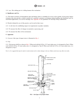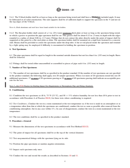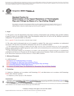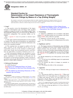 SIGNIFICANCE AND USE 4.1 The impact resistance of thermoplastic pipe and fittings relates to suitability for service and to quality of processing. Impact resistance may also provide a relative measure of a material's resistance to breakage during handling and installation and, for non-buried applications, to in-service breakage. See Appendix X5 for guidelines for selecting testing combinations. 4.2 Results obtained by use of this practice can be used in three ways: 4.2.1 As the basis for establishing impact test requirements in product standards, 4.2.2 To measure the effect of changes in materials or processing, and 4.2.3 To measure the effect of the environment. SCOPE 1.1 This practice covers the determination of the impact resistance of thermoplastic pipe and fittings under specified conditions of impact by means of a tup (falling weight). Three interchangeable striking noses are used on the tup, differing in geometrical configuration. Two specimen holders are described. Note 1: Appendix X1 shows the procedure to determine impact strength. 1.2 The values stated in inch-pound units are to be regarded as standard. The values given in parentheses are mathematical conversions to SI units that are provided for information only and are not considered standard. 1.3 This standard does not purport to address all of the safety concerns, if any, associated with its use. It is the responsibility of the user of this standard to establish appropriate safety, health, and environmental practices and determine the applicability of regulatory limitations prior to use. 1.4 This international standard was developed in accordance with internationally recognized principles on standardization established in the Decision on Principles for the Development of International Standards, Guides and Recommendations issued by the World Trade Organization Technical Barriers to Trade (TBT) Committee.