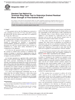 1.2 This test method provides a procedure for performing a torsional ring shear test under a drained condition to determine the residual shear strength of fine-grained soils. This test method is performed by shearing a reconstituted, overconsolidated, presheared specimen at a controlled displacement rate until the constant drained shear resistance is established on a single shear surface determined by the configuration of the apparatus.