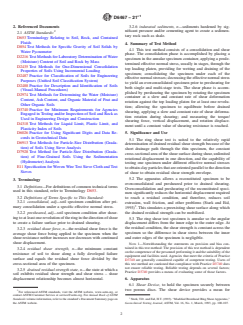 1.4 An intact specimen or a specimen with a natural shear surface can be used for testing. However, obtaining a natural slip surface specimen, determining the direction of field shearing, and trimming and aligning the usually non-horizontal shear surface in the ring shear apparatus is difficult. As a result, this test method focuses on the use of a reconstituted specimen to determine the residual strength. An unlimited amount of continuous shear displacement can be achieved to obtain a residual strength condition in a ring shear device.