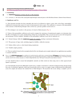 SIGNIFICANCE AND USE 4.1 This document describes the basic principles that need to be followed to obtain a mean value of the Darcy permeability coefficient for structures that consist of a series of interconnected voids or pores. The coefficient is a measure of the permeability of the structure to fluid flowing through it that is driven by a pressure gradient created across it. 4.2 The technique is not sensitive to the presence of closed or blind-end pores (Fig. 1). FIG. 1 Schematic of the Different Pores Types Found in Tissue Scaffolds. Fluid Flow Through the Structure is via the Open Pores 4.3 Values of the permeability coefficient can be used to compare the consistency of manufactured samples or to determine what the effect of changing one or more manufacturing settings has on permeability. They can also be used to assess the homogeneity and anisotropy of tissue scaffolds. Variability in the permeability coefficient can be also be indicative of: 4.3.1 Internal damage within the sample, for example, cracking or permanent deformation. 4.3.2 The presence of large voids, including trapped air bubbles, within the structure. 4.3.3 Surface effects such as a skin formed during manufacture. 4.3.4 Variable sample geometry. 4.4 This test method is based on the assumption that the flow rate through a given sample subjected to an applied pressure gradient is constant with time. Note 1: If a steady-state flow condition isn’t reached, then this could be due to structural damage (that is, crack formation or the porous structure deformed as a result of the force being placed upon it by the fluid flowing through it). Sample deformation in the form of stretching (bowing) can also occur for less resilient structures as a result of high fluid flow rates. This topic is discussed in more detail in Section 7. 4.5 Care should be taken to ensure that hydrophobic materials are fully wetted out when using water or other aqueous-based liquids as permeants. 4.6 Conventionally, the p... SCOPE 1.1 This guide describes test methods suitable for determining the mean Darcy permeability coefficient for a porous tissue scaffold, which is a measure of the rate at which a fluid, typically air or water, flows through it in response to an applied pressure gradient. This information can be used to optimize the structure of tissue scaffolds, to develop a consistent manufacturing process, and for quality assurance purposes. 1.2 The method is generally nondestructive and non-contaminating. 1.3 The method is not suitable for structures that are easily deformed or damaged. Some experimentation is usually required to assess the suitability of permeability testing for a particular material/structure and to optimize the experimental conditions. 1.4 Measures of permeability should not be considered as definitive metrics of the structure of porous tissue scaffolds and should complement measures obtained by other investigative techniques, for example, scanning electron microscopy, gas flow porometry, and micro-computer X-ray tomography (Guides F2450, F2603, and F3259). 1.5 This standard does not purport to address all of the safety concerns, if any, associated with its use. It is the responsibility of the user of this standard to establish appropriate safety, health, and environmental practices and determine the applicability of regulatory limitations prior to use. 1.6 This international standard was developed in accordance with internationally recognized principles on standardization established in the Decision on Principles for the Development of International Standards, Guides and Recommendations issued by the World Trade Organization Technical Barriers to Trade (TBT) Committee.