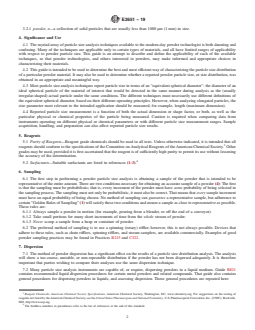 SIGNIFICANCE AND USE 4.1 The myriad array of particle size analysis techniques available to the modern-day powder technologist is both daunting and confusing. Many of the techniques are applicable only to certain types of materials, and all have limited ranges of applicability with respect to powder particle size. This guide is an attempt to describe and define the applicability of each of the available techniques, so that powder technologists, and others interested in powders, may make informed and appropriate choices in characterizing their materials. 4.2 This guide is intended to be used to determine the best and most efficient way of characterizing the particle size distribution of a particular powder material. It may also be used to determine whether a reported powder particle size, or size distribution, was obtained in an appropriate and meaningful way. 4.3 Most particle size analysis techniques report particle size in terms of an “equivalent spherical diameter”: the diameter of an ideal spherical particle of the material of interest that would be detected in the same manner during analysis as the (usually irregular-shaped) actual particle under the same conditions. The different techniques must necessarily use different definitions of the equivalent spherical diameter, based on their different operating principles. However, when analyzing elongated particles, the size parameter most relevant to the intended application should be measured; for example, length (maximum dimension). 4.4 Reported particle size measurement is a function of both the actual dimension or shape factor, or both, as well as the particular physical or chemical properties of the particle being measured. Caution is required when comparing data from instruments operating on different physical or chemical parameters or with different particle size measurement ranges. Sample acquisition, handling, and preparation can also affect reported particle size results. SCOPE 1.1 This guide covers the use of many available techniques for particle size measurement and particle size distribution analysis of solid particulate (powder) materials, off-line in a laboratory. It does not apply to in-line (on-line) analysis, nor to analysis of liquid droplets or liquid aerosols. The guide is intended to serve as a resource for powder/particle technologists in characterizing their materials. 1.2 This guide provides significant detail regarding the numerous particle size analysis methods available. Although this guide is extensive, it may not be all inclusive. 1.3 The principle of operation, range of applicability, specific requirements (if any), and limitations of each of the included particle size analysis techniques are listed and described, so that users of this guide may choose the most useful and most efficient technique for characterizing the particle size distribution of their particular material(s). 1.4 The values stated in SI units are to be regarded as standard. No other units of measurement are included in this standard. 1.5 This standard does not purport to address all of the safety concerns, if any, associated with its use. It is the responsibility of the user of this standard to establish appropriate safety, health, and environmental practices and determine the applicability of regulatory limitations prior to use. 1.6 This international standard was developed in accordance with internationally recognized principles on standardization established in the Decision on Principles for the Development of International Standards, Guides and Recommendations issued by the World Trade Organization Technical Barriers to Trade (TBT) Committee.