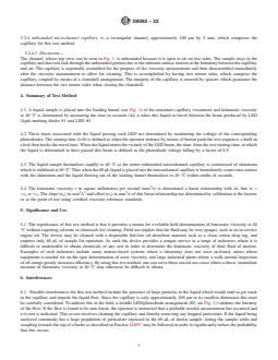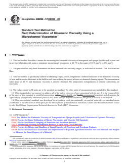 SIGNIFICANCE AND USE 5.1 The significance of this test method is that it provides a means for a reliable field determination of kinematic viscosity at 40 °C without requiring solvents or chemicals for cleaning. Field use implies that the fluid may be very opaque, such as an in-service engine oil. The device may be cleaned with a disposable lint-free oil-absorbent material such as a clean cotton shop rag, and requires only 60 µL of sample for operation. As such the device provides a unique service to a range of industries where it is difficult or undesirable to obtain chemicals of any sort in order to determine the kinematic viscosity of their fluid of interest. Examples of such industries include many marine-based systems where a laboratory does not exist on-board, mines where equipment is needed for on-the-spot determination of asset viscosity, and large industrial plants where a walk-around inspection of oil sumps greatly increases efficiency. By using this test method, one can serve these crucial use-cases where a direct, immediate measure of kinematic viscosity at 40 °C may otherwise be difficult to obtain. SCOPE 1.1 This test method describes a means for measuring the kinematic viscosity of transparent and opaque liquids such as new and in-service lubricating oils using a miniature microchannel viscometer at 40 °C in the range of 12.9 mm2/s to 174 mm2/s 1.2 The precision has only been determined for those materials and viscosity ranges, as indicated in Section 17 on Precision and Bias. 1.3 This test method is specifically tailored to obtaining a rapid, direct, temperature- stabilized measure of the kinematic viscosity of new and in-service lubricants in the field in real- time without the use of solvents or chemical cleaning agents. The measurement takes place at 40 °C and kinematic viscosity is directly obtained. No temperature extrapolations or density corrections are necessary. 1.4 The values stated in SI units are to be regarded as standard. No other units of measurement are included in this standard. 1.5 This standard does not purport to address all of the safety concerns, if any, associated with its use. It is the responsibility of the user of this standard to establish appropriate safety, health, and environmental practices and determine the applicability of regulatory limitations prior to use. Some specific hazards statements are given in Section 9 on Hazards. 1.6 This international standard was developed in accordance with internationally recognized principles on standardization established in the Decision on Principles for the Development of International Standards, Guides and Recommendations issued by the World Trade Organization Technical Barriers to Trade (TBT) Committee.