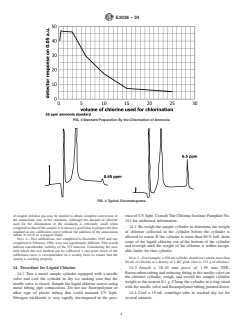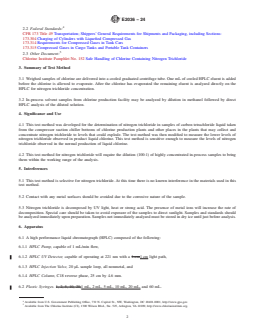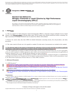 SIGNIFICANCE AND USE 4.1 This test method was developed for the determination of nitrogen trichloride in samples of carbon tetrachloride liquid taken from the compressor suction chiller bottoms of chlorine production plants and other places in the plants that may collect and concentrate nitrogen trichloride to levels that could explode. The test method was then modified to measure the lower levels of nitrogen trichloride observed in product liquid chlorine. This test method is sensitive enough to measure the levels of nitrogen trichloride observed in the normal production of liquid chlorine. 4.2 This test method for nitrogen trichloride will require the dilution (100:1) of highly concentrated in-process samples to bring them within the working range of the analysis. SCOPE 1.1 This test method uses high performance liquid chromatography (HPLC) to determine nitrogen trichloride levels in liquid chlorine at the 0.1 μg/g (ppm) to 600 μg/g (ppm) range. Solvent samples from chlorine production facilities containing very high concentrations of nitrogen trichloride may be analyzed by dilution with methanol. 1.2 Review the current safety data sheet (SDS) for detailed information concerning toxicity, first aid procedures, and safety precautions. 1.3 The values stated in SI units are to be regarded as standard. No other units of measurement are included in this standard. 1.4 The following applies for the purposes of determining the conformance of the test results using this test method to applicable specifications, results shall be rounded off in accordance with the rounding-off method of Practice E29. 1.5 This standard does not purport to address all of the safety concerns, if any, associated with its use. It is the responsibility of the user of this standard to establish appropriate safety, health, and environmental practices and determine the applicability of regulatory limitations prior to use. Specific hazard statements are given in Section 8. 1.6 This international standard was developed in accordance with internationally recognized principles on standardization established in the Decision on Principles for the Development of International Standards, Guides and Recommendations issued by the World Trade Organization Technical Barriers to Trade (TBT) Committee.