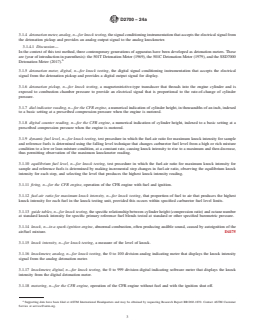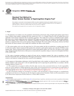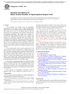 SIGNIFICANCE AND USE 5.1 Motor O.N. correlates with commercial automotive spark-ignition engine antiknock performance under severe conditions of operation. 5.2 Motor O.N. is used by engine manufacturers, petroleum refiners and marketers, and in commerce as a primary specification measurement related to the matching of fuels and engines. 5.2.1 Empirical correlations that permit calculation of automotive antiknock performance are based on the general equation: Values of k1, k2, and k3 vary with vehicles and vehicle populations and are based on road-octane number determinations. 5.2.2 Motor O.N., in conjunction with Research O.N., defines the antiknock index of automotive spark-ignition engine fuels, in accordance with Specification D4814. The antiknock index of a fuel approximates the road octane ratings for many vehicles, is posted on retail dispensing pumps in the United States, and is referred to in vehicle manuals. This is more commonly presented as: 5.3 Motor O.N. is used for measuring the antiknock performance of spark-ignition engine fuels that contain oxygenates. 5.4 Motor O.N. is important in relation to the specifications for spark-ignition engine fuels used in stationary and other nonautomotive engine applications. 5.5 Motor O.N. is utilized to determine, by correlation equation, the Aviation method O.N. or performance number (lean-mixture aviation rating) of aviation spark-ignition engine fuel.7 SCOPE 1.1 This laboratory test method covers the quantitative determination of the knock rating of liquid spark-ignition engine fuel in terms of Motor octane number, including fuels that contain up to 25 % v/v of ethanol. However, this test method may not be applicable to fuel and fuel components that are primarily oxygenates.2 The sample fuel is tested in a standardized single cylinder, four-stroke cycle, variable compression ratio, carbureted, CFR engine run in accordance with a defined set of operating conditions. The octane number scale is defined by the volumetric composition of primary reference fuel blends. The sample fuel knock intensity is compared to that of one or more primary reference fuel blends. The octane number of the primary reference fuel blend that matches the knock intensity of the sample fuel establishes the Motor octane number. 1.2 The octane number scale covers the range from 0 to 120 octane number, but this test method has a working range from 40 to 120 octane number. Typical commercial fuels produced for automotive spark-ignition engines rate in the 80 to 90 Motor octane number range. Typical commercial fuels produced for aviation spark-ignition engines rate in the 98 to 102 Motor octane number range. Testing of gasoline blend stocks or other process stream materials can produce ratings at various levels throughout the Motor octane number range. 1.3 The values of operating conditions are stated in SI units and are considered standard. The values in parentheses are the historical inch-pounds units. The standardized CFR engine measurements continue to be in inch-pound units only because of the extensive and expensive tooling that has been created for this equipment. 1.4 For purposes of determining conformance with all specified limits in this standard, an observed value or a calculated value shall be rounded “to the nearest unit” in the last right-hand digit used in expressing the specified limit, in accordance with the rounding method of Practice E29. 1.5 This standard does not purport to address all of the safety concerns, if any, associated with its use. It is the responsibility of the user of this standard to establish appropriate safety, health, and environmental practices and determine the applicability of regulatory limitations prior to use. For more specific hazard statements, see Section 8, 14.4.1, 15.5.1, 16.6.1, Annex A1, A2.2.3.1, A2.2.3.3(6) and (9), A2.3.5, X3.3.7, X4.2.3.1, X4.3.4.1, X4.3.9.3, X4.3.12.4, and X4.5.1.8. ...