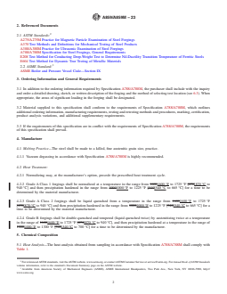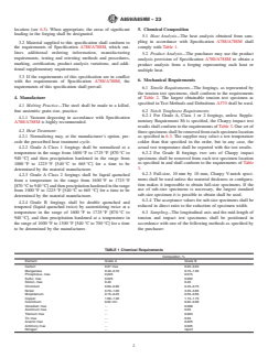 ABSTRACT This specification covers the standard requirements for low-carbon age-hardened nickel-copper-chromium-molybdenum-columbium alloy steel forgings for pressure vessel components. Materials shall be manufactured to a killed fine austenitic grain size, by vacuum degas melting process. Heat treatment shall be conducted, according to class, by: normalizing and precipitation hardening (Grade A, Class 1); liquid quenching and precipitation hardening (Grade A, Class 2); or double liquid-quenching, tempering, double austenitizing, and precipitation hardening (Grade B). Heat and product analyses shall be used to evaluate the conformance of forgings to required chemical compositions. Tensile, notch toughness, and Charpy impact requirements shall be examined, for which one of four sampling methods may be employed. One tension test and one impact test (for three samples) shall be made for each forging. Dimensions and finishes of the forgings shall conform to that specified by the purchaser. Repair welding shall also be performed only if permitted by the purchaser. SCOPE 1.1 This specification covers requirements for low-carbon age-hardening nickel-copper-chromium-molybdenum-columbium alloy steel forgings for pressure vessel components. 1.2 Forgings under this specification are available as Grades A or B. Grade A may be ordered in one or two classes as follows: 1.2.1 Grade A Class 1—Normalized-and-precipitation-heat-treated, providing a minimum yield strength of 55 ksi [380 MPa] and a minimum tensile strength of 65 ksi [450 MPa]. 1.2.2 Grade A Class 2—Quenched-and-precipitation-heat-treated, providing a minimum yield strength of 65 ksi [450 MPa] and a minimum tensile strength of 75 ksi [515 MPa]. 1.2.3 Grade A was the original steel composition in this specification. 1.3 Although the material is readily weldable, welding procedures are of fundamental importance and must be such as not to affect adversely the properties of the material, especially in the heat-affected zone. It is presupposed that welding procedures will be suitable for the material being welded. 1.4 Supplementary requirements, including those applicable in Specification A788/A788M, are provided for use when additional testing or inspection is desired. These shall apply only when specified individually by the purchaser in the order. 1.5 The values stated in either SI units or inch-pound units are to be regarded separately as standard. The values stated in each system are not necessarily exact equivalents; therefore, to ensure conformance with the standard, each system shall be used independently of the other and values from the two systems shall not be combined. 1.6 This specification is expressed in both inch-pound and SI units. However, unless the order specifies the applicable “M” specification designation [SI units], the material shall be furnished to inch-pound units. 1.7 This international standard was developed in accordance with internationally recognized principles on standardization established in the Decision on Principles for the Development of International Standards, Guides and Recommendations issued by the World Trade Organization Technical Barriers to Trade (TBT) Committee.