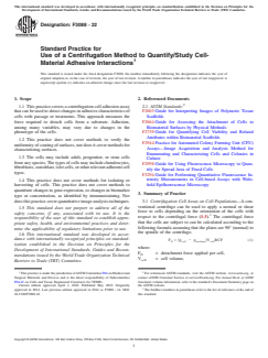 ASTM F3088-22 is a standard published by ASTM International. Its full title is "Standard Practice for Use of a Centrifugation Method to Quantify/Study Cell-Material Adhesive Interactions". This standard covers: SIGNIFICANCE AND USE 4.1 This practice describes a cell adhesion method that can be used to provide a detachment percent at a given RCF for cells that have adhered to a substrate, typically for a short time. The information generated by this practice can be used to obtain a semi-quantitative measurement of the adhesion of cells to either an uncoated or pre-coated substrate, when compared to a reference (adherent) cell type on the same substrate. As described in Reyes and Garcia (2003), it is recommended that the 50 % point be used for either ligand concentration or RCF for the most robust measurement of adhesion strength. The adhesion may vary due to changes in the phenotype of the cells or as a result of the specific properties of the surface. The substrate may include tissue culture-treated polystyrene, biomaterials, or bioactive surfaces. If the substrate is a hydrogel, care must be taken to avoid cohesive failure in the hydrogel (that is, detached cells have pulled away fragments of gel). The coating may consist of (but is not limited to) the following: natural or synthetic biomaterials, hydrogels, components of extracellular matrix (ECM), ligands, adhesion or bioactive molecules, genes, or gene products. Cell concentration is also critical, as use of too high a concentration of cells may result in cells detaching as a sheet, rather than as individual cells. This centrifugation approach, once validated, may be applicable for quality control (QC) and product development. However, until the method is correlated to other measures of cell attachment, the current method should be run in parallel with other known measures of cell adhesion. 4.2 This practice does not cover methods to quantitate changes in gene expression, or changes in biomarkers, as identified by immunostaining. This practice additionally does not cover quantitative image analysis techniques. In some cases, the change in adhesive properties may reflect on the degree of differentiation or de-differentiation of the cells... SCOPE 1.1 This practice covers a centrifugation cell adhesion assay that can be used to detect changes in adhesive characteristics of cells with passage or treatments. This approach measures the force required to detach cells from a substrate. Adhesion, among many variables, may vary due to changes in the phenotype of the cells. 1.2 This practice does not cover methods to verify the uniformity of coating of surfaces, nor does it cover methods for characterizing surfaces. 1.3 The cells may include adult, progenitor, or stem cells from any species. The types of cells may include chondrocytes, fibroblasts, osteoblast, islet cells, or other relevant adherent cell types. 1.4 This practice does not cover methods for isolating or harvesting of cells. This practice does not cover methods to quantitate changes in gene expression, or changes in biomarker type or concentration, as identified by immunostaining. Nor does this practice cover quantitative image analysis techniques. 1.5 This standard does not purport to address all of the safety concerns, if any, associated with its use. It is the responsibility of the user of this standard to establish appropriate safety, health, and environmental practices and determine the applicability of regulatory limitations prior to use. 1.6 This international standard was developed in accordance with internationally recognized principles on standardization established in the Decision on Principles for the Development of International Standards, Guides and Recommendations issued by the World Trade Organization Technical Barriers to Trade (TBT) Committee.