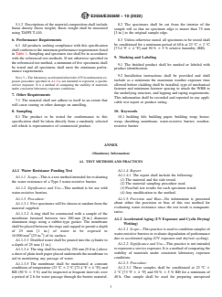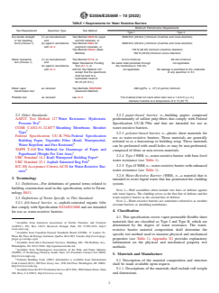 SCOPE 1.1 This specification is limited to vapor permeable flexible sheet materials which are intended to be mechanically attached and are generally installed behind the cladding system in exterior walls. 1.2 This specification is limited to the evaluation of materials and does not address installed performance. Although the fastening practices (type of fastener, fastening schedule, etc.) may affect the installed function of these materials, they are not included in this specification. 1.3 This specification does not address integration of the water-resistive barrier with other wall elements. The topic is addressed in more detail in Practice E2112 and Guide E2266. 1.4 The values stated in either SI units or inch-pound units are to be regarded separately as standard. The values stated in each system are not necessarily exact equivalents; therefore, to ensure conformance with the standard, each system shall be used independently of the other, and values from the two systems shall not be combined. 1.5 This standard does not purport to address all of the safety concerns, if any, associated with its use. It is the responsibility of the user of this standard to establish appropriate safety, health, and environmental practices and determine the applicability of regulatory limitations prior to use. 1.6 This international standard was developed in accordance with internationally recognized principles on standardization established in the Decision on Principles for the Development of International Standards, Guides and Recommendations issued by the World Trade Organization Technical Barriers to Trade (TBT) Committee.