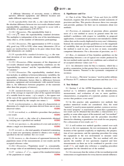 ASTM E177-20 is a standard published by ASTM International. Its full title is "Standard Practice for Use of the Terms Precision and Bias in ASTM Test Methods". This standard covers: ABSTRACT The purpose of this practice is to present concepts necessary to the understanding of the terms “precision” and “bias” as used in quantitative test methods. This practice also describes methods of expressing precision and bias and, in a final section, gives examples of how statements on precision and bias may be written for ASTM test methods. A statement of precision allows potential users of a test method to assess in general terms the test method’s usefulness with respect to variability in proposed applications. SIGNIFICANCE AND USE 4.1 Part A of the “Blue Book,” Form and Style for ASTM Standards, requires that all test methods include statements of precision and bias. This practice discusses these two concepts and provides guidance for their use in statements about test methods. 4.2 Precision—A statement of precision allows potential users of a test method to assess in general terms the test method’s usefulness with respect to variability in proposed applications. A statement of precision is not intended to exhibit values that can be exactly duplicated in every user’s laboratory. Instead, the statement provides guidelines as to the magnitude of variability that can be expected between test results when the method is used in one, or in two or more, reasonably competent laboratories. For a discussion of precision, see 8.1. 4.3 Bias—A statement of bias furnishes guidelines on the relationship between a set of typical test results produced by the test method under specific test conditions and a related set of accepted reference values (see 9.1). 4.3.1 An alternative term for bias is trueness, which has a positive connotation, in that greater bias is associated with less favorable trueness. Trueness is the systematic component of accuracy. 4.4 Accuracy—The term “accuracy,” used in earlier editions of Practice E177, embraces both precision and bias (see 9.3). SCOPE 1.1 The purpose of this practice is to present concepts necessary to the understanding of the terms “precision” and “bias” as used in quantitative test methods. This practice also describes methods of expressing precision and bias and, in a final section, gives examples of how statements on precision and bias may be written for ASTM test methods. 1.2 This standard does not purport to address all of the safety concerns, if any, associated with its use. It is the responsibility of the user of this standard to establish appropriate safety, health, and environmental practices and determine the applicability of regulatory limitations prior to use. 1.3 This international standard was developed in accordance with internationally recognized principles on standardization established in the Decision on Principles for the Development of International Standards, Guides and Recommendations issued by the World Trade Organization Technical Barriers to Trade (TBT) Committee.