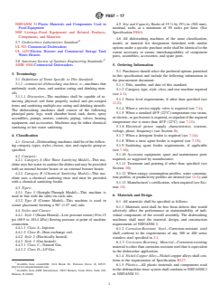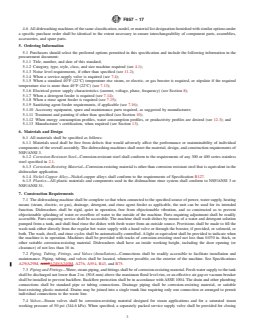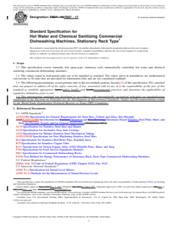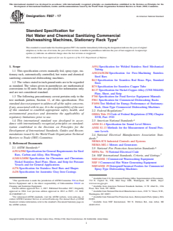 ASTM F857-17 is a technical specification published by ASTM International. Its full title is "Standard Specification for Hot Water and Chemical Sanitizing Commercial Dishwashing Machines, Stationary Rack Type". This standard covers: ABSTRACT This specification covers the material, design, and performance requirements pertinent to the construction of spray-type, stationary rack commercial dishwashing machines that are manually fed yet automatically controlled to uniformly wash, rinse, and sanitize eating and drinking utensils. Representative production models of the washers shall pass performance, operation, leakage, and energy and productivity tests, and should function satisfactorily as specified. Certification, product marking, and packaging are also considered. SCOPE 1.1 This specification covers manually fed, spray-type, stationary rack, automatically controlled, hot water and chemical sanitizing commercial dishwashing machines. 1.2 The values stated in inch-pound units are to be regarded as standard. The values given in parentheses are mathematical conversions to SI units that are provided for information only and are not considered standard. 1.3 The following precautionary caveat pertains only to the test methods portion, Section 12, of this specification: This standard does not purport to address all of the safety concerns, if any, associated with its use. It is the responsibility of the user of this standard to establish appropriate safety, health, and environmental practices and determine the applicability of regulatory limitations prior to use. 1.4 This international standard was developed in accordance with internationally recognized principles on standardization established in the Decision on Principles for the Development of International Standards, Guides and Recommendations issued by the World Trade Organization Technical Barriers to Trade (TBT) Committee.