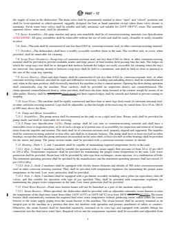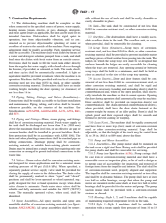 ABSTRACT This specification covers the material, design, and performance requirements pertinent to the construction of spray-type, stationary rack commercial dishwashing machines that are manually fed yet automatically controlled to uniformly wash, rinse, and sanitize eating and drinking utensils. Representative production models of the washers shall pass performance, operation, leakage, and energy and productivity tests, and should function satisfactorily as specified. Certification, product marking, and packaging are also considered. SCOPE 1.1 This specification covers manually fed, spray-type, stationary rack, automatically controlled, hot water and chemical sanitizing commercial dishwashing machines. 1.2 The values stated in inch-pound units are to be regarded as standard. The values given in parentheses are mathematical conversions to SI units that are provided for information only and are not considered standard. 1.3 The following precautionary caveat pertains only to the test methods portion, Section 12, of this specification: This standard does not purport to address all of the safety concerns, if any, associated with its use. It is the responsibility of the user of this standard to establish appropriate safety, health, and environmental practices and determine the applicability of regulatory limitations prior to use. 1.4 This international standard was developed in accordance with internationally recognized principles on standardization established in the Decision on Principles for the Development of International Standards, Guides and Recommendations issued by the World Trade Organization Technical Barriers to Trade (TBT) Committee.