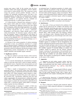 SIGNIFICANCE AND USE 5.1 This test method is necessary because of the need for rapid reliable tests for carbonaceous material in waters and sediments. 5.2 It is used for determining the concentration of organic carbon in water that comes from a variety of natural, domestic, and industrial sources. Typically, these measurements are used to monitor organic pollutants in domestic and industrial waste water. 5.3 When a sample is homogenized so that particulate, immiscible phases, and dissolved carbon from both organic and inorganic sources is determined, the measurement is called total carbon (TC). When inorganic carbon response is eliminated by removing the dissolved CO2 prior to the analysis or the dissolved CO2 concentration subtracted from the total carbon concentration, the measurement is called total organic carbon (TOC). When particulates and immiscible phases are removed prior to analysis the measurement is called dissolved carbon (DC), or dissolved organic carbon (DOC) if inorganic carbon response has been eliminated. 5.4 Homogenizing or sparging of a sample, or both, may cause loss of volatile organics, thus yielding a negative error. The extent and significance of such losses must be evaluated on an individual basis. If significant quantities of volatile carbonaceous materials are present or may be present in samples organic carbon should be determined by the difference between the total carbon and the inorganic carbon concentrations. When organic carbon determined both by difference and by sparging agree it is acceptable to determine organic carbon by sparging for similar samples. 5.5 The relationship of TOC to other water quality parameters such as COD and BOD is described in the literature.5 SCOPE 1.1 This test method covers the determination of total and organic carbon in water and waste water, including brackish waters and brines in the range from 2 to 20 000 mg/L. This test method has the advantages of a wide range of concentration which may be determined without sample dilution and the provision for boat or capillary introduction of samples containing sediments and particulate matter where syringe injection is inappropriate. 1.2 This procedure is applicable only to that carbonaceous matter in the sample that can be introduced into the reaction zone. When syringe injection is used to introduce samples into the combustion zone, the syringe needle opening size limits the maximum size of particles that can be present in samples. Sludge and sediment samples must be homogenized prior to sampling with a micropipetor or other appropriate sampler and ladle introduction into the combustion zone is required. 1.3 The precision and bias information reported in this test method was obtained in collaborative testing that included waters of the following types: distilled, deionized, potable, natural, brine, municipal and industrial waste, and water derived from oil shale retorting. Since the precision and bias information reported may not apply to waters of all matrices, it is the user’s responsibility to ensure the validity of this test method on samples of other matrices. 1.4 The values stated in SI units are to be regarded as standard. No other units of measurement are included in this standard. 1.5 This standard does not purport to address all of the safety concerns, if any, associated with its use. It is the responsibility of the user of this standard to establish appropriate safety, health, and environmental practices and determine the applicability of regulatory limitations prior to use. For specific precautionary statements, see 9.1 and 10.2.1. 1.6 This international standard was developed in accordance with internationally recognized principles on standardization established in the Decision on Principles for the Development of International Standards, Guides and Recommendations issued by the World Trade Organization Technical Barriers to Trade (TBT) Committee.