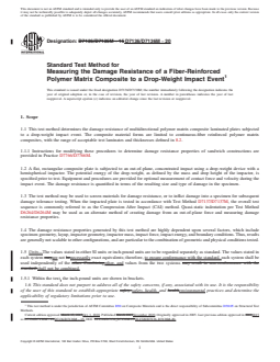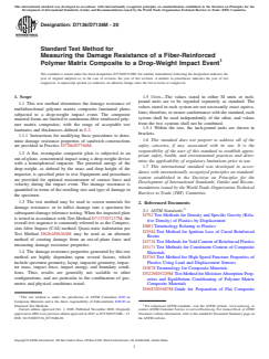 1.1 This test method determines the damage resistance of multidirectional polymer matrix composite laminated plates subjected to a drop-weight impact event. The composite material forms are limited to continuous-fiber reinforced polymer matrix composites, with the range of acceptable test laminates and thicknesses defined in 8.2.